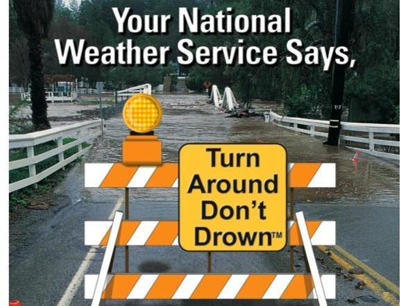 Rushing water in the form of a flash flood can quickly become deadly. Just a few inches of fast-moving flood water can knock you off of your feet while just one to two feet of moving water can overtake a car forcing it off the road. The combination of the force of flowing water and buoyancy floating a vehicle make driving into flood waters extremely dangerous. Just one foot of water will float most cars and wash them away downstream. Most flood deaths occur in automobiles. When approaching water flowing over the road, turn around and go the other way. Turn around – don’t drown.